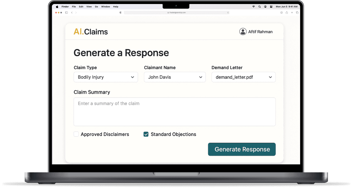 AI.Claims quickly spots weak points in a claim. We can flag issues with coverage like policy limits, exclusions, or signs of intentional behavior. We can compare police reports and witness statements to highlight questions about who was really at fault. AI.Claims can also help spot excessive treatment, claims that don’t match the injuries, and damages that don't match injury. After we find the holes and soft spots in the file, AI.Claims addresses each in the demand response letter to reduce payouts and improve leverage.